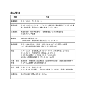 経験値が低かったり、しばらく美容の仕事から離れていてブランクがある方でも大歓迎です。技術と接客ともにマニュアルがありますので参考にされてください。